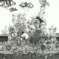 青木は一貫して紙とペンを使い、圧倒的なまでに緻密な描線と点描によって、不可思議な生命体を描出してきました。植物の蔓や花弁、動物の様々な器官が絡み合うモチーフには隅々にまで作家の意識が行き渡り、息をのむような驚きと、目で追い続ける楽しみを与えてくれます。