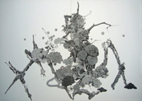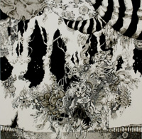 青木は一貫して紙とペンを使い、圧倒的なまでに緻密な描線と点描によって、不可思議な生命体を描出してきました。植物の蔓や花弁、動物の様々な器官が絡み合うモチーフには隅々にまで作家の意識が行き渡り、息をのむような驚きと、目で追い続ける楽しみを与えてくれます。