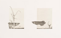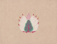 動物でもあり植物でもあるかのような奇妙な姿をした生き物を、繊細な筆致で和紙に描くマリアーネ。作品にしばしば現れる生殖器にも似た形は、現代社会において、彼女が己の身体感覚と向き合う中で立ち現れてくる、生命エネルギーの象徴でもあるのです。