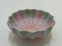 顔料を混ぜて淡く彩色した陶土と磁土を細い紐状にし、束ねるように、あるいは撚り合わせるように組み合わせて、薄くスライスする。これを、型紙に合わせて面状につなぎ合わせ、さらに石膏型に貼り込んで成形。カンナで表面を整えたあと、釉をかけずにそのまま焼成することで、極小のマーブル文様にいろどられた、あやういほどに繊細な、独特の造形を得ている。(国立近代美術館工芸館「非情のオブジェ─現代工芸の11人」展カタログ(2004年)より抜粋)