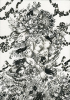 The viewer’s eyes are trapped in a maze which is like a world of thick black line and dots. It is Hitomi Aoki’s work that tells us a story of living things that generates and annihilates infinitely. Aoki’s form that covers all over the plane whispers into our sense.